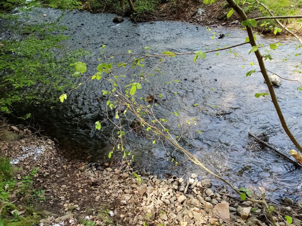 Der zweite Teil erschien mir in diesem Jahr der schwierigere. Zunächst folgten wir dem Bärenpfad stetig steigend bis fast zum Ortsrand von Gimbweiler um dann wieder auf einem Waldweg fallend fast bis zum Ziel. Dort war ein kleiner Tisch mit Getränken bereitgestellt. Nun musste ein von Robert "Mauer" genannter kurzer, aber sehr steiler Anstieg bewältigt werden. Weiter ging es leichter steigend zum Weisenberg, wieder hinunter zur Autobahn, neben dieser nochmals aufwärts und über die Autobahn hinweg abwärts zur Nahe. An dieser lief man einen kleinen Pfad entlang mit einer kleinen Abkühlung der Füße bei einer Wasserquerung zurück ins Ziel. Die nachfolgenden Bilder stammen vom letzten Abschnitt an der Nahe entlang. Die Wasserquerung sieht man auf dem letzten Bild.