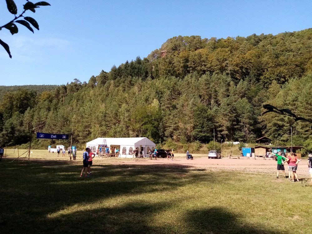 Die Strecke war 11 Kilometer lang bei 445 Höhenmeter. Sie führte zunächst zur Falkenburg hinauf und auf einem Pfad wieder hinab. Es folgte der Aufstieg zur Deichenwand über einen Pfad, der sogar eine kurze Sicherung aufwies. Weiter ging es auf und ab, auf Pfaden und Wegen, immer im Wald, bis das Stadion wieder erreicht wurde. Im Stadion musste noch eine 400 Meter Runde absolviert werden. Ich erreichte in 1:11 Stunden das Ziel.