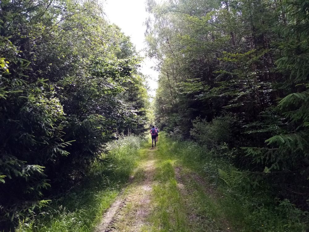 So fuhren Paul und ich am Sonntag nach Mörscheid. Das Wetter war für Juni eher kühl und stark bewölkt, die Sonne blinzelte nur ab und an aus den Wolken. Außer einem kurzen leichten Schauer war es aber trocken, also eigentlich ideales Laufwetter. Ich startete um 9 Uhr, alle anderen Distanzen um 10 Uhr. Die Strecke verläuft in großen Teilen im Nationalpark Hunsrück-Hochwald und teilweise auch auf dem Saar-Hunsrück-Steig. Es wird auf Wegen und Pfaden meist im Wald gelaufen. Nach dem Start stieg die Strecke zum Mörschieder Burr, einer Felsformation, an, an der man vorbeiläuft und einen guten Ausblick hat. Weiter ging es überwiegend leicht fallend im Wald bis zum Ortsrand nach Herborn mit dem ersten Verpflegungspunkt (VP). An den VP gab es u.a. Wasser, Cola, Wassermelonen und Bananen.