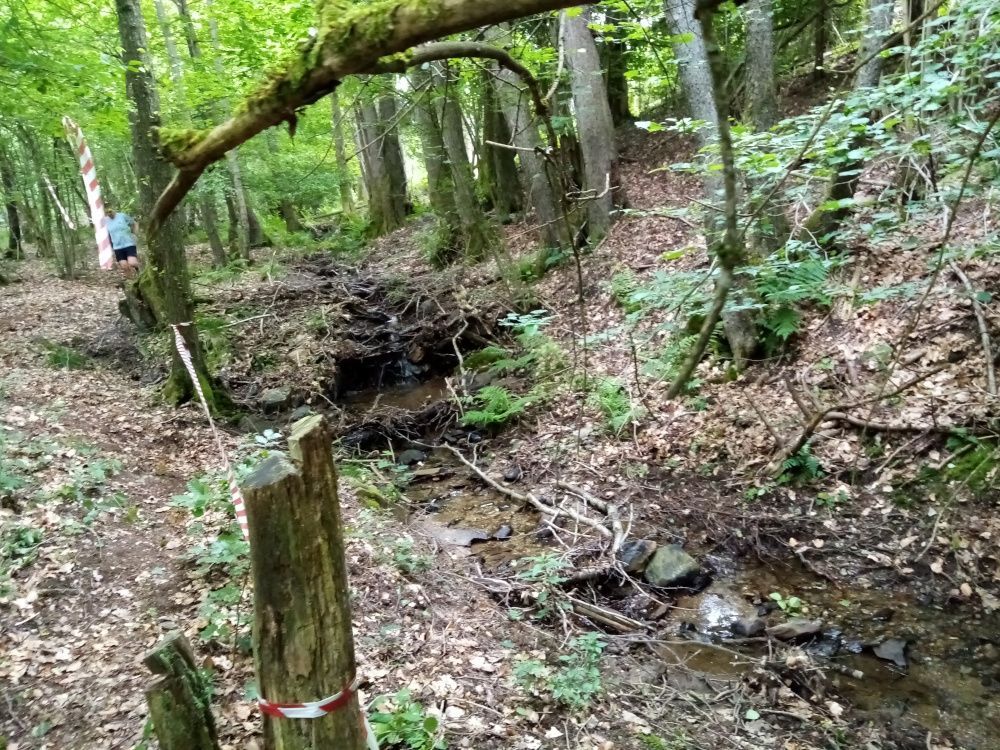 Weiter ging es leicht wellig zunächst im offenen Gelände und dann wieder im Wald bis zu einem steilen Abstieg ins Idarbachtal. Man lief auf einem kleinen, mit Bändern markierten Pfad, am Bach entlang, hinunter zur zweiten VP. Solche Pfade machen mir immer Spaß.