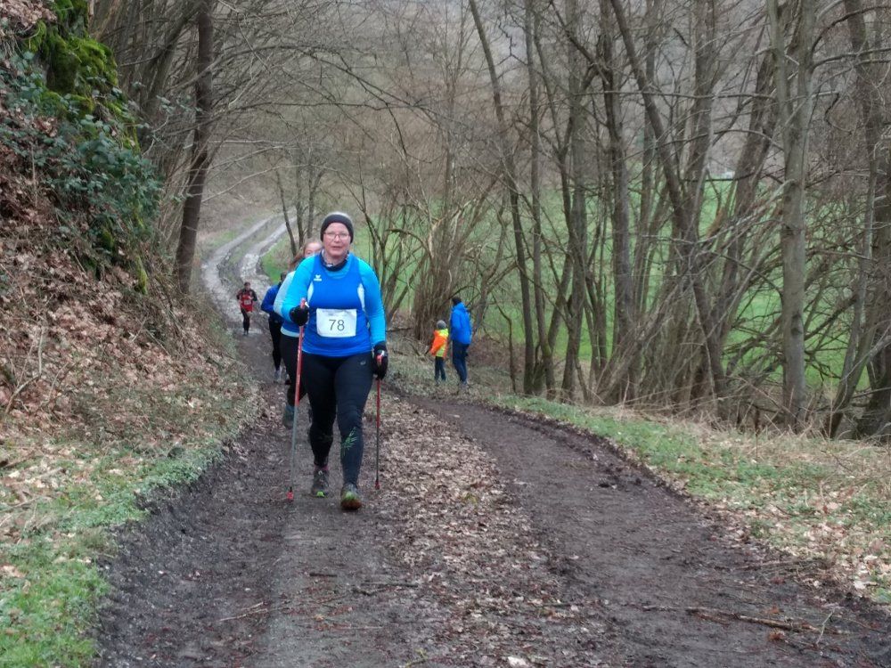 Die Strecke startete zunächst asphaltiert mit einem steileren Anstieg. Es folgte ein welliger Teil durch den Wald (kurz bei der Mittelstrecke und länger bei der Langstrecke) und über eine Wiese. Über diese Wiese und einen kurzen Waldweg führte die Strecke direkt steil abwärts. Weiter lief man weitgehend eben über einen Waldweg und am Ende asphaltiert zurück zum Ziel. Die nicht asphaltierten Waldwege waren sehr matschig, der Abstieg über die sehr naße Wiese eine echte Herausforderung. Mir hat dies aber Spaß gemacht.