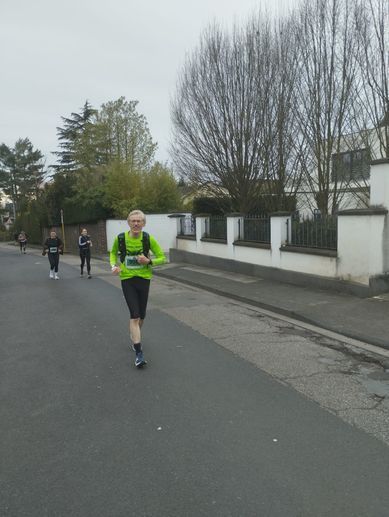 Rudolf flitzt uns voraus und wir laufen mit Angelo im Windschatten hinterher. Auf der 1. Runde sind wir recht flott unterwegs, Angelo gibt richtig Gas und plötzlich sehen wir Ihn nicht mehr, aber genauso plötzlich holen wir ihn auf den letzten 6 km wieder ein und er bewegt sich dann in unserem Windschatten .