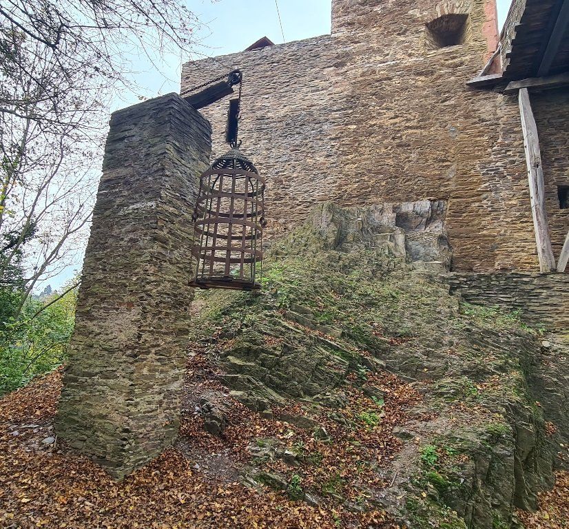 Burgen sind von nah und fern unsere Begleiter und ein abgehängter Gitterkäfig lässt die Grausamkeit im Mittelalter erahnen.