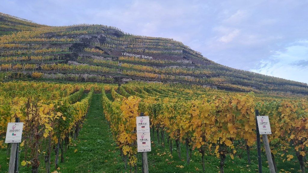 Jetzt sind es noch ca. 7 Km über den Moselrad-Weg bis ins Ziel. Wir laufen an herrlich bunten Weinbergen entlang und kosten einige verbliebenen Weintrauben die zuckersüß schmecken.