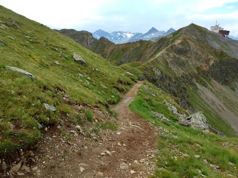 Nun stand der letzte, aber mit fast 1000 Höhenmeter längste Aufstieg, zur Segantinihütte, mit 2731 m dem höchsten Punkt der Strecke, an. Es war ein Pfad mit sehr vielen Serpentinen zu bewältigen. Entlohnt wurde man von einem herrlichen Blick auf die Berninagruppe (leider teilweise in Wolken) und die Oberengadiner Seen.