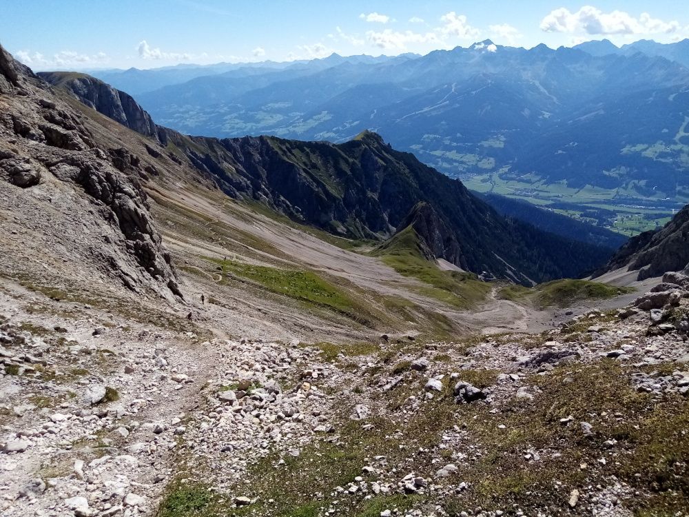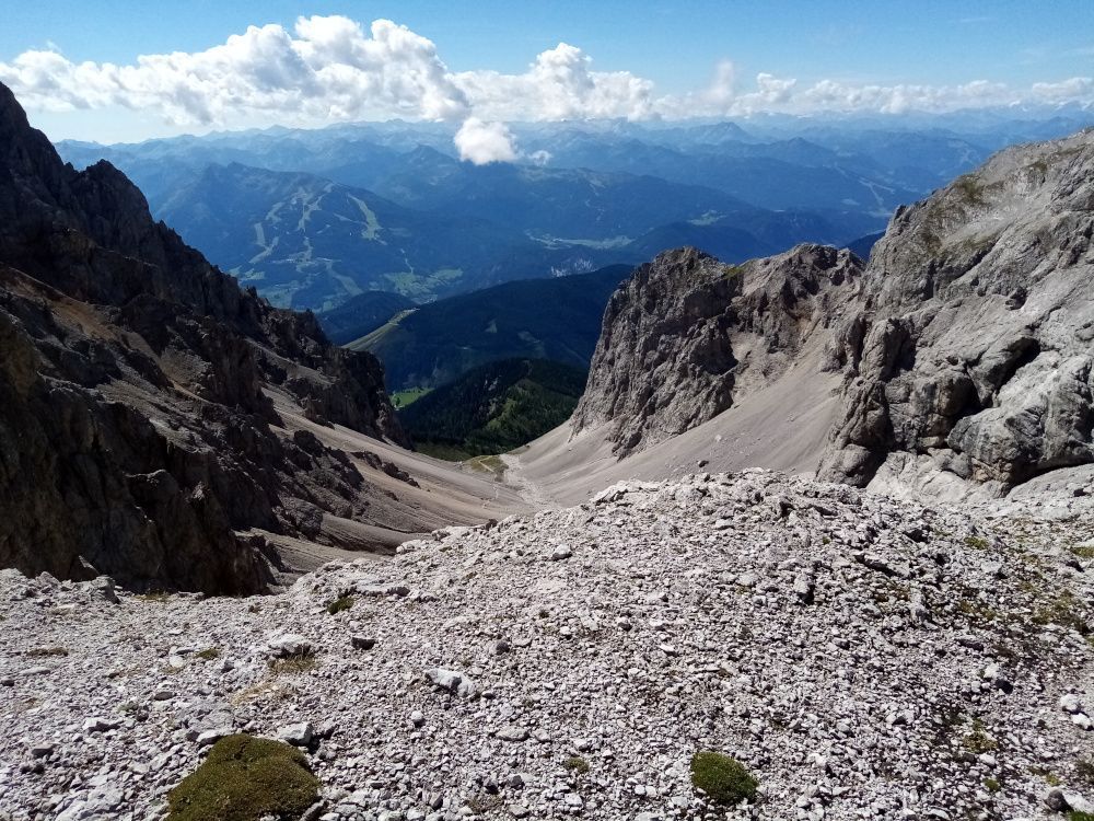 Die Verpflegungsstationen waren mit Wasser, Iso und Cola und Salztabletten, Sportriegel/gels, Bananen, Äpfel und Essiggurken bestückt. Mittlerweile war es warm geworden und ich war froh um meine Trinkblase, da die VP doch weiter auseinander lagen. Ich füllte sie an den VPs immer wieder auf. Von der Hütte führte der Weg in Kehren zur Stanglalm hinauf und weiter über schwieriges felsiges Gelände mit Blick u.a. zum Silberkarsee zur Feisterscharte (2198 m). Hier konnte man unterhalb das Guttenberghaus (2146 m) sehen, das mit einem Gegenanstieg erreicht wurde (km 15,5). Dort hatte man einen schönen Blick in die Tauern. Bei der VP waren leider die Bananen ausgegangen. Meine Differenz auf die Cut-Off Zeit war auf 45 Minuten gesunken.